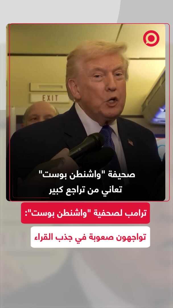 في تعليق حاد.. الرئيس الأمريكي دونالد ترامب يقول لمراسلة صحيفة "واشنطن بوست" إن مؤسستها الإعلامية تعاني من تراجع واضح وصعوبات كبيرة في استقطاب القراء، وأن عليهم الاستمرار في هذا النهج بسخرية. #ترامب #واشنطن